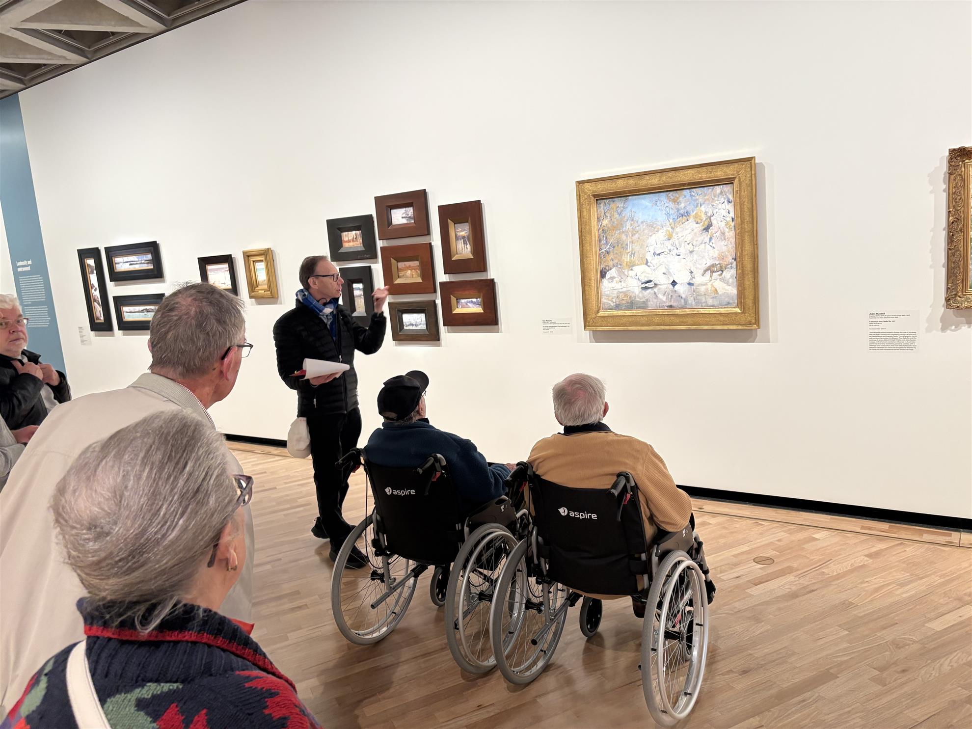 Russel took us to the colourful impressionist scenes of Monet, the intense religious themed art from an earlier era, Blue Poles and the extravagances of those early gallery purchases (now seemingly bargains at the time!), and then the development of Australian native artwork of Nolan and Roberts and the Heidelberg School known for its impressionistic style and focus on capturing the Australian landscape.